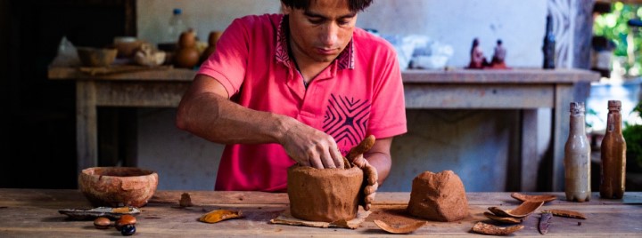 Na região do povo Xakriabá, o barro serve como matéria-prima essencial para as obras de arte. Os cuidados começam desde o planejamento para a extração, escolhendo a fase apropriada da lua para a tarefa, passando pela pintura, a secagem, até a queima, onde a peça adquire resistência.