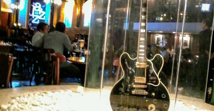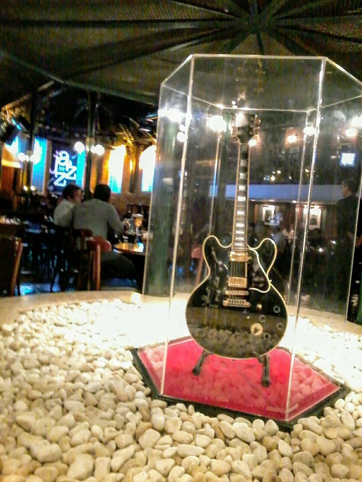 Na entrada, em uma redoma de vidro, a guitarra do primeiro show de B. B. King (ele se apresentou oito vezes na casa), assinada pelo artista.