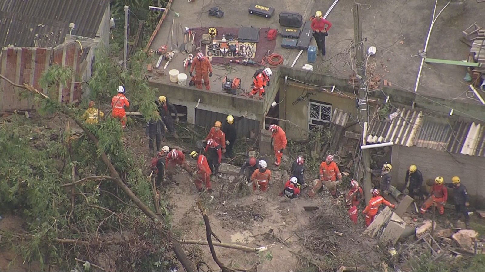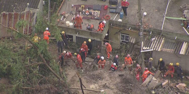 Dezenas de bombeiros trabalham para resgatar de duas crianças, de seis meses e seis anos, da mãe delas e da madrinha de uma delas, que ficaram soterradas sob um barranco que deslizou em uma casa no bairro Vila Ideal, em Ibirité, na Região Metropolitana de Belo Horizonte. O acidente aconteceu na manhã desta sexta-feira (24) e segundo o pai dos meninos, todos estavam em casa no momento do desabamento. O solo encharcado dificulta o trabalho dos bombeiros.