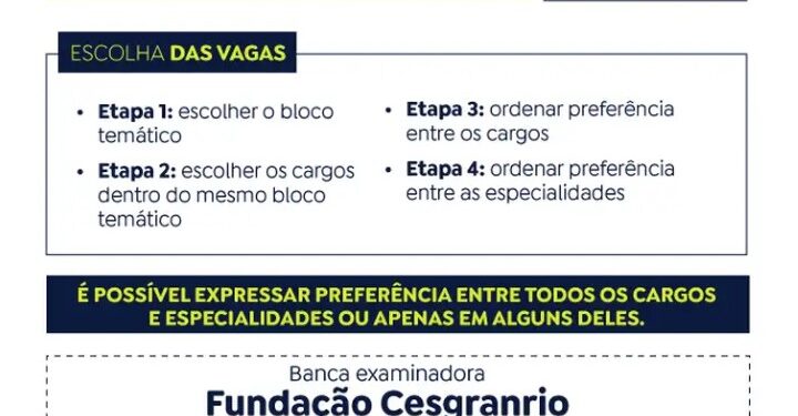 O candidato poderá concorrer a todos os cargos dentro do mesmo bloco temático. As inscrições começam na próxima sexta-feira (19), vão até 6 de fevereiro e serão feitas exclusivamente pelo Portal Gov.br. As taxas custam R$ 60 (nível médio) e R$ 90 (nível superior). Estão isentos de pagamento os inscritos no CadÚnico; doadores de medula óssea; bolsistas ou ex-bolsistas do ProUni; bolsistas ou ex-bolsistas do Fundo de Financiamento Estudantil (Fies).