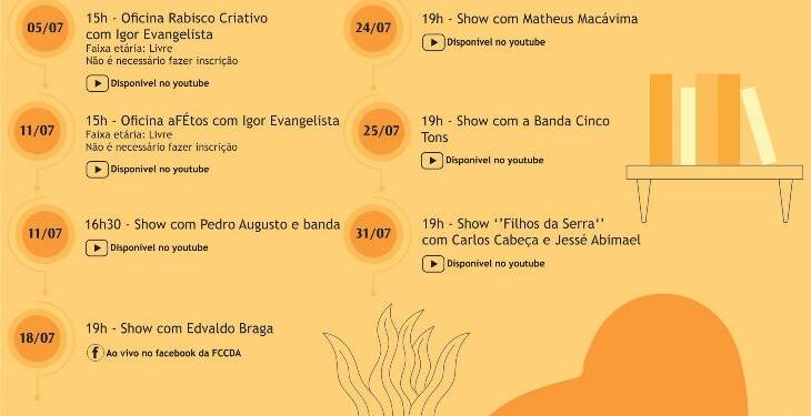 Nesta primeira agenda online, a programação contará com oficinas para todas as idades, além de apresentações musicais. Todo o conteúdo, gravado previamente, será disponibilizado no canal da FCCDA no YouTube.