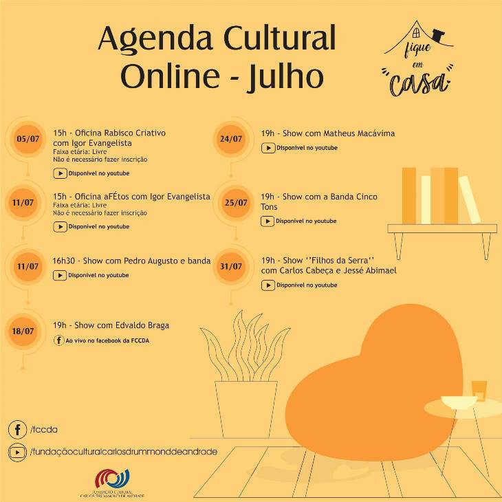 Estreia em julho a agenda cultural online da Fundação Cultural Carlos Drummond de Andrade (FCCDA). A programação é resultado do edital de credenciamento de artistas para a contratação de conteúdo digital — esse mecanismo visa garantir tanto o acesso da população a conteúdos artístico quanto apoiar os profissionais do setor durante a pandemia do novo coronavírus (COVID-19).