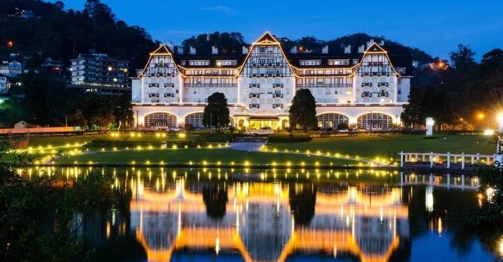 Até uma praia foi construída no alto da serra. Centenas de caminhões trouxeram toneladas de areia da praia de Copacabana para fazer as margens do lago, cujo fundo era recoberto por lajotas e seu desenho formava o mapa do Brasil, sendo a pequena ilha na qual está um farol, representando a Ilha de Marajó. Por aqui era possível ver guarda-sóis armados e hóspedes com trajes de banho. Hoje em dia o local não tem mais nenhuma cara de praia, mas os gramados bem cuidados são convidativos, perfeitos para um piquenique ao ar livre.