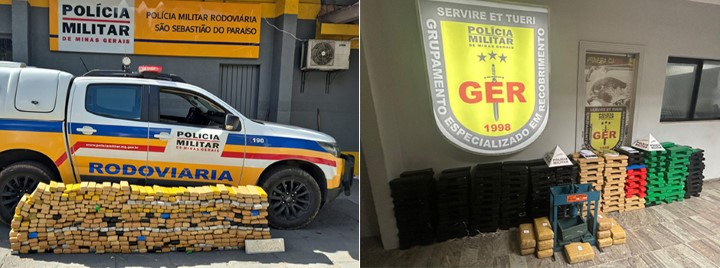 Na quarta-feira (30/10), militares do Batalhão de Polícia Militar Rodoviária (BPMRv) apreenderam cerca de 450 quilos de drogas na MG-050, em São Sebastião do Paraíso, no Sudoeste do estado. A ação contou com apoio da aeronave Pégasus e de militares do 43º batalhão.