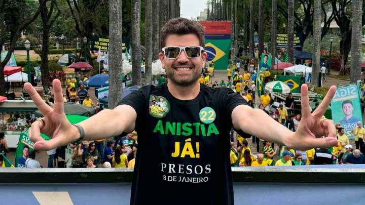 Nas redes sociais, apresenta-se como “empresário, cristão e de direita”. Em sua página, ostenta viagens, eventos partidários e registros próximos a políticos do PL, como Bruno Engler e vereadores bolsonaristas da capital mineira.
