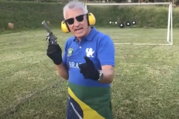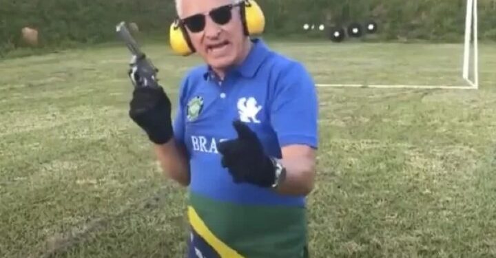 Nas imagens, publicadas em 13 de março de 2021, o empresário, identificado como José Sabatini, da cidade de Artur Nogueira (SP), dispara um revólver contra alvos em um campo de futebol e ataca Lula.